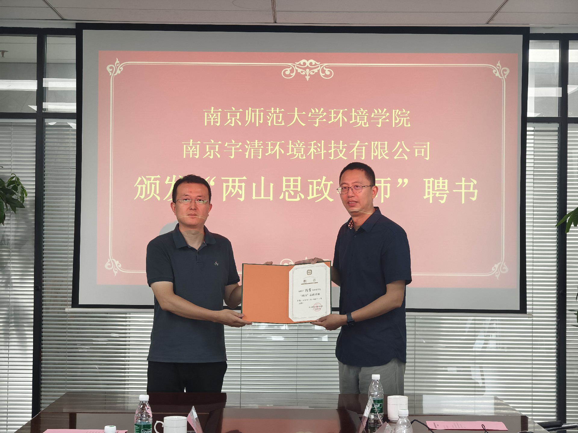 随后,双方举行了隆重的签约与授牌仪式。在双方代表的见证下,环境学院与williamhill中文官网正式签署“就业创业实践基地协议书”,副院长左晓俊向企业授予“产学研就业创业实践基地”铜牌,党委副书记李鹏向williamhill中文官网董事长陈雷颁发“‘两山’思政导师”。